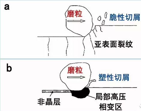 兩種脆性材料的去除機(jī)理:a脆性斷裂去除,b塑性流動(dòng)去除