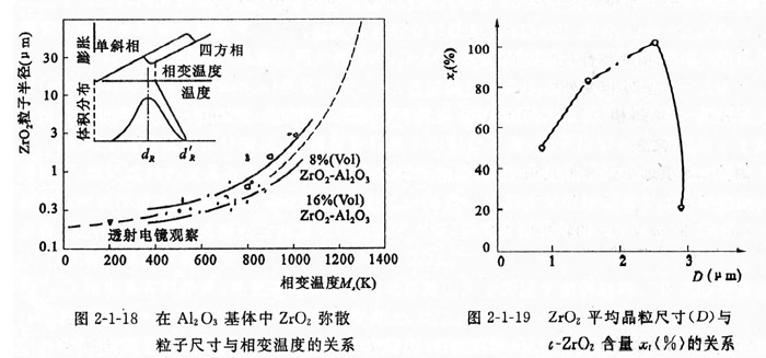 氧化鋯的顆粒尺寸,對相變增韌是有影響的。實踐表明,氧化鋯相變的條件應是單位體積的氧化鋯顆粒數(shù)的總能量相當于氧化鋯相變引起的界面能變化。氧化鋯在陶瓷基體中的相變溫度是氧化鋯顆粒尺寸和化學組分的函數(shù),圖2-1-18表明了1696 (VoI) 氧化鋯-A1209和8~6( V01)氧化鋯 -Alz 03系統(tǒng)中的氧化鋯相變溫度與其顆粒度之間的關系。由此看出,在冷卻過程中顆粒大者優(yōu)先由四方相轉(zhuǎn)變?yōu)閱涡毕唷<囱趸啅浬⒂谔沾苫w中的相變溫度M.是隨著氧化鋯顆粒的減小而偏低的。當氧化鋯顆粒小到足以使相變溫度偏移到常溫下,即t-氧化鋯 -直保持到常溫,則陶瓷基體中就儲存了相變彈性壓應變能(,-丁),只有當基體受到了適量的外加張應力,其對氧化鋯的束縛得以解除,才能發(fā)生四方相氧化鋯向單斜相氧化鋯轉(zhuǎn)化。如果氧化鋯顆粒尺寸較大,則其相變溫度處于常溫以上,那么制品冷卻至室溫之前,t-氧化鋯就已自發(fā)地轉(zhuǎn)化為m-氧化鋯。而且氧化鋯品粒尺寸對t-氧化鋯含量的影響也是很重要的。如圖2-1-19所示。從圖中看出,最高的t-氧化鋯的含量只處于很窄的晶粒尺寸范圍內(nèi)。